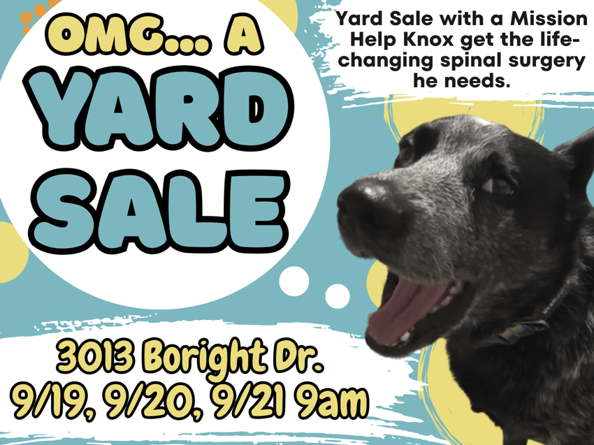 Sometimes a yard sale is about more than clearing out closets—it’s about hope, love, and second chances. September 19th–21st, our community is invited to rally behind Knox, a sweet, snack-loving pup facing a rare neurological condition called Tethered Cord Syndrome. As the condition progresses, everyday joys like walking, standing, and playing have become increasingly difficult. His family has found a trusted medical team and is preparing for surgery this October, but the cost is steep.
