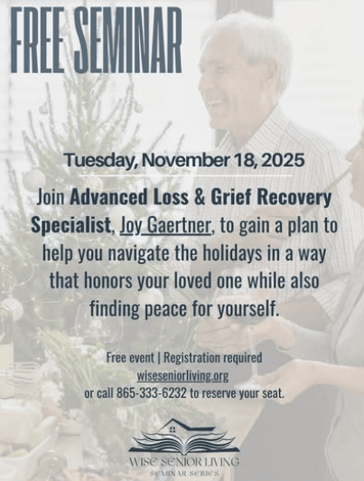 The seminar is open to anyone seeking support — whether for themselves or someone they care about. It will be held on November 18th from 10 am - 11:30 am at the Fox Den Country Club (). Come as you are, and take a moment to heal in community this holiday season. Register here or call (865) 333-6232.