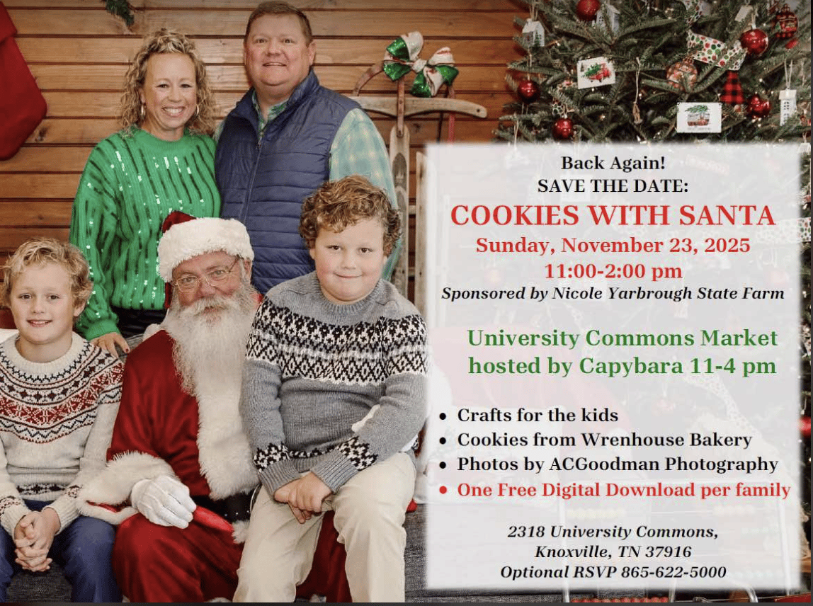 The holiday season is getting a sweet start with the return of Cookies with Santa, happening Sunday, November 23rd, from 11:00 a.m. to 2:00 p.m. at University Commons (2318 University Commons). Sponsored by Nicole Yarbrough State Farm, this beloved family event is part of the University Commons Market hosted by Capybara, running from 11 a.m. to 4 p.m.