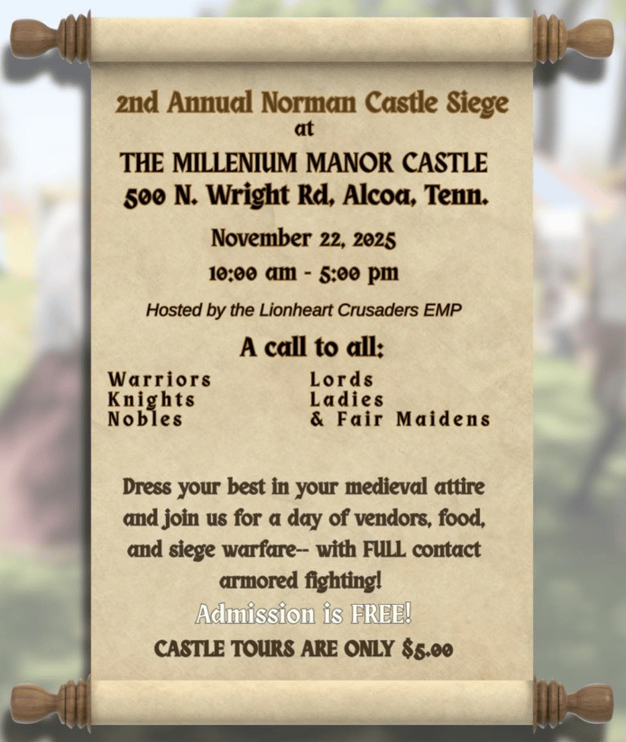Hear ye, hear ye! Warriors, nobles, lords, ladies, and fair maidens are invited to gather for an unforgettable day of medieval excitement at the 2nd Annual Norman Castle Siege, hosted at the historic Millennium Manor Castle (500 N. Wright Road) in Alcoa. The event takes place on November 22nd, from 10:00 AM to 5:00 PM, promising a full day of immersive fun, fantasy, and fierce armored combat.