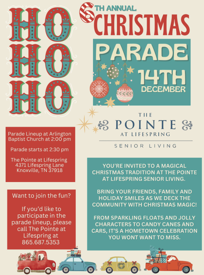 Anyone interested in joining the parade is welcome! If you’d like to participate in the lineup, simply contact The Pointe at Lifespring at (865) 687-5353. Whether you're watching from the sidelines or riding along in the parade, this beloved event is a wonderful way to make memories and spread joy during the holidays. Don’t miss this festive hometown tradition!