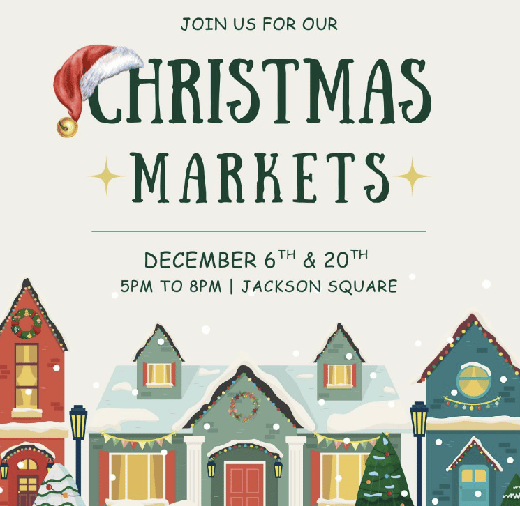 Visitors can browse handcrafted goods from local vendors, enjoy live holiday music, warm up with hot cocoa and seasonal snacks, and snap festive photos in front of beautifully decorated storefronts. Whether you’re hunting for unique Christmas gifts or simply looking for a cozy night out with friends and family, the Jackson Square Christmas Market offers something for everyone.