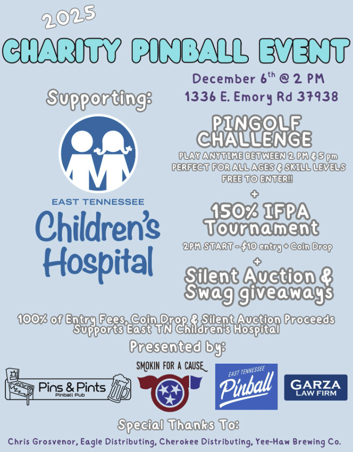 Pinball fans are invited to Pins & Pints Pinball Pub (1336 E. Emory Road) on December 6th, for a fun-filled Charity Pinball Event benefiting East Tennessee Children’s Hospital. The event runs from 2:00–5:00 PM and promises an afternoon of silver-ball action for players of all skill levels.
