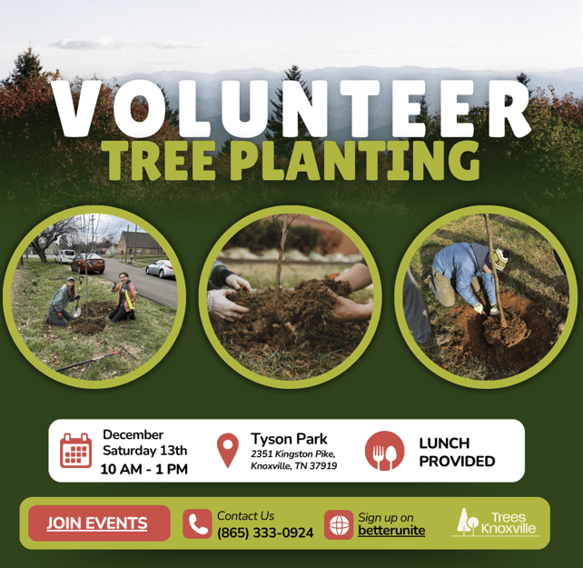 Trees Knoxville, in partnership with the City of Knoxville, is inviting the community to take part in a large-scale tree planting event at Tyson Park (2351 Kingston Pike) on December 13th, from 10:00 AM to 1:00 PM. Volunteers will help plant more than 60 trees, expanding shade, improving stormwater absorption, enhancing wildlife habitat, and strengthening Knoxville’s urban tree canopy. The event is open to all ages and experience levels, and all tools and instructions will be provided by trained staff and certified arborists.