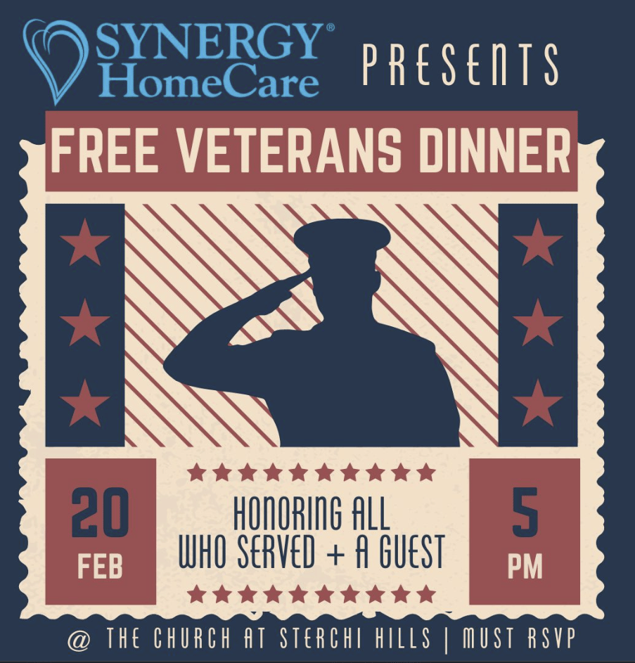 Local veterans are invited to be honored and celebrated at a Veterans Appreciation Dinner on February 20th, beginning at 5:00 p.m. at The Church at Sterchi Hills (904 Dry Gap Pike NE). Hosted by Synergy HomeCare of Knoxville–Morristown, the evening is dedicated to recognizing and thanking those who have served our country.