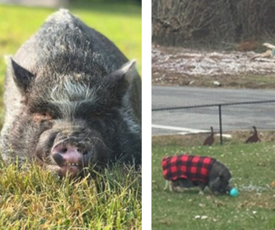 Sheldon is an 8-year-old mini pig who moved to Tennessee from California with his family this past June. Because the home sits along a busy road, the family fenced in their large front yard for safety, giving Sheldon plenty of room to graze while still being visible to passersby. He also has a smaller inner fenced area, but his favorite place is the front lawn, where he can watch the world go by—and where the world can watch him.