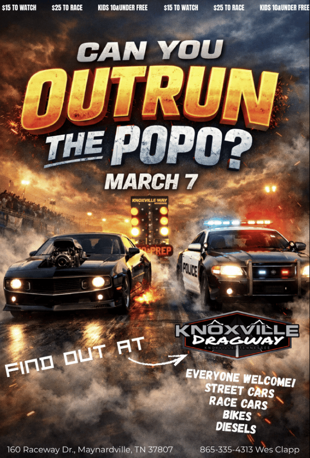 Rev your engines and mark your calendar—Outrun The Po Po is roaring back to Knoxville Dragway on March 7th, from 10 a.m. to 4 p.m., for a full day of high-octane fun, friendly competition, and community support.